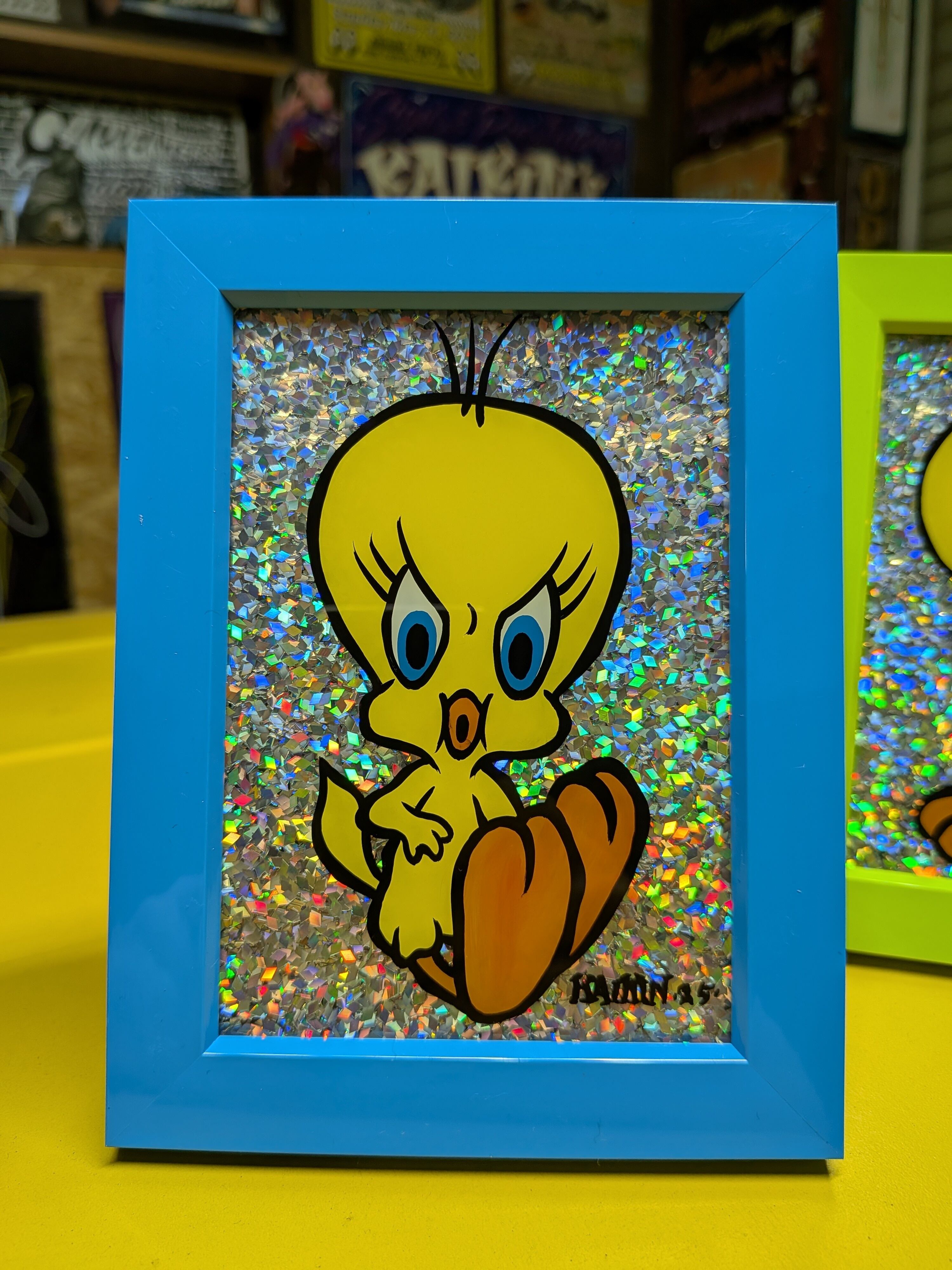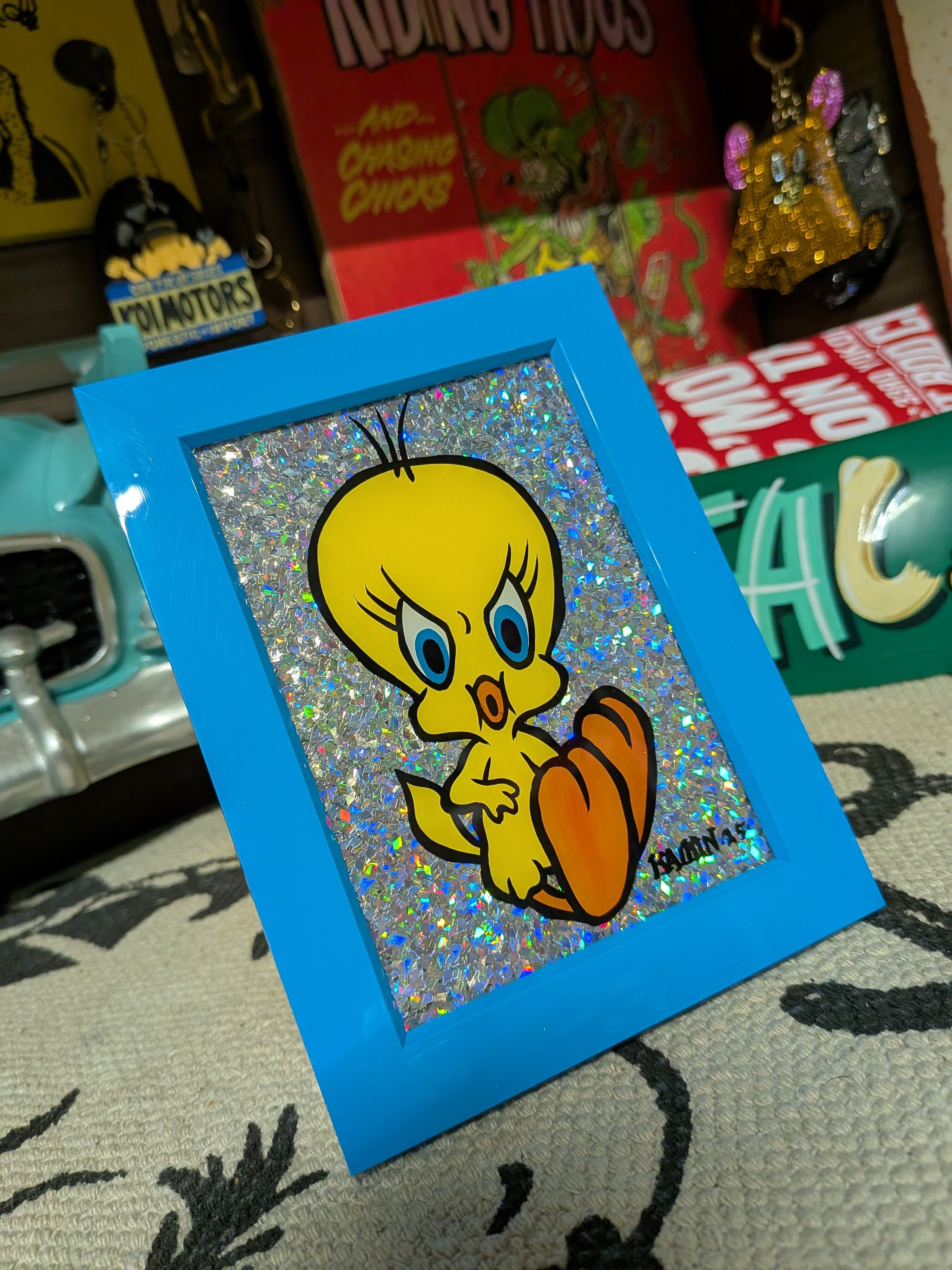 ガラスのプレートの裏からイラストのペイント後、ロスフレークで背景をキラキラにした、コンパクトだけど派手派手なアートピースです。